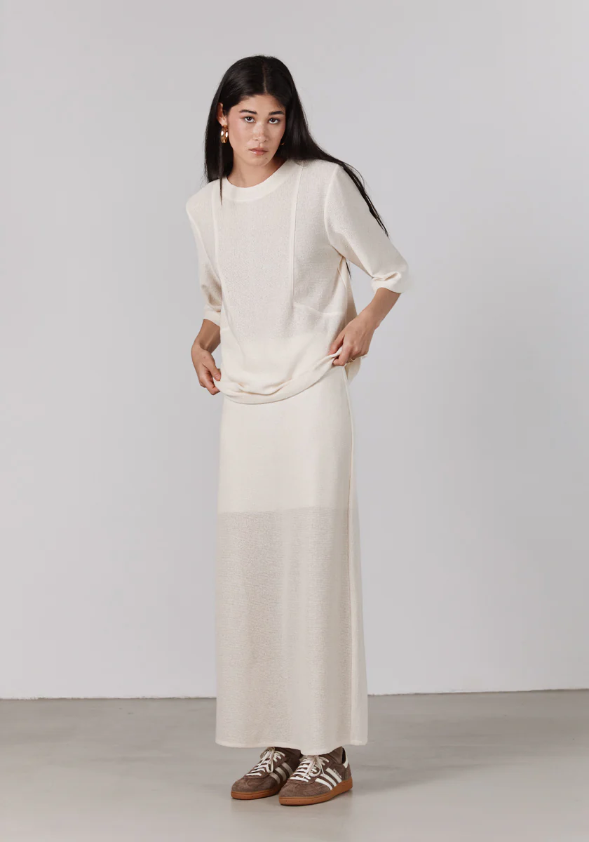 FLORA, la jupe longue revisitée en maille coton. Longueur cool et parfaite pour un look très SŌNGE. C'est la jupe indipensable de la saison.