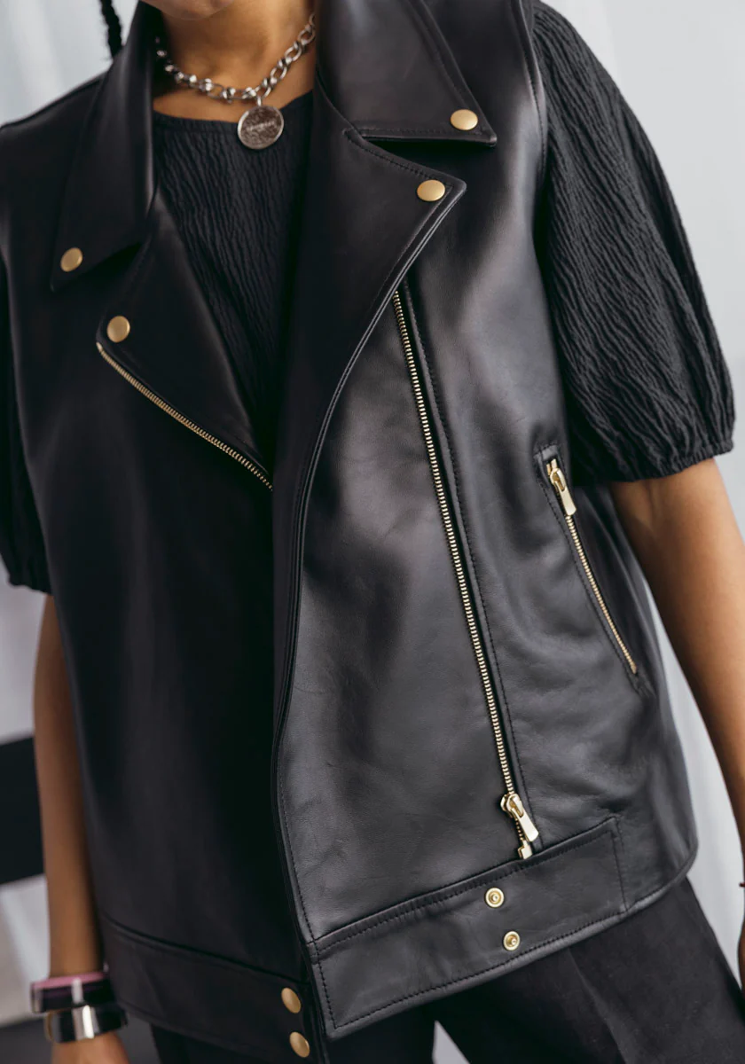 JORGE, le Perfecto sans manches made in France aux découpes marquées et aux bijouteries dorées de choix. On aime tout chez lui, sa coupe droite, ample et oversize et ses doubles pressions à la ceinture.