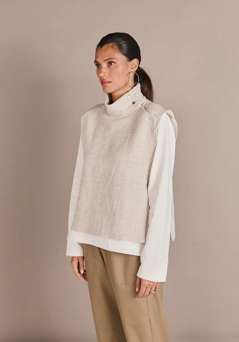 PAZ, le nouveau top qui vient jouer le rÎle d'un plastron, confectionné dans un trÚs beau tissu chiné. C'est le top à superposer à l'infini avec son col montant et ses pressions argent aux épaules.