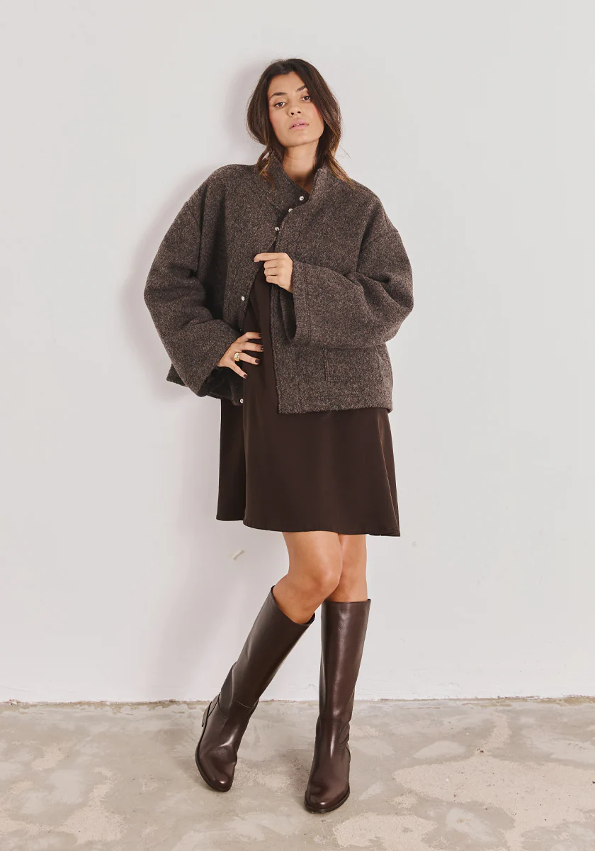 À associer avec la robe MORA chocolat et les bottes cavalières FELIZ chocolat pour un look automnal chic, féminin et structuré.